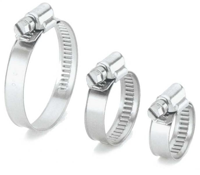 Fascetta stringitubo con diametro regolabile da 40 a 60 mm. Provvista di anello in acciaio inox a cremagliera stampata (larghezza 12 mm, spessore 0.7 mm) e cassetto in acciaio legato a basso tenore di carbonio con trattamento galvanico di nichelatura. Bordi arrotondati per evitare danneggiamenti al tubo. Vite in acciaio zincato con taglio cacciavite a croce da 7 mm.